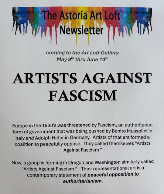 The Astoria Art Loft Gallery is open to visitors. The Loft presents new art every month by local, regional and international artists. Receptions for our gallery's featured artists are customarily held to coincide with the ongoing Second Saturday Astoria Artwalk from 1:00 pm to 4:00 pm.